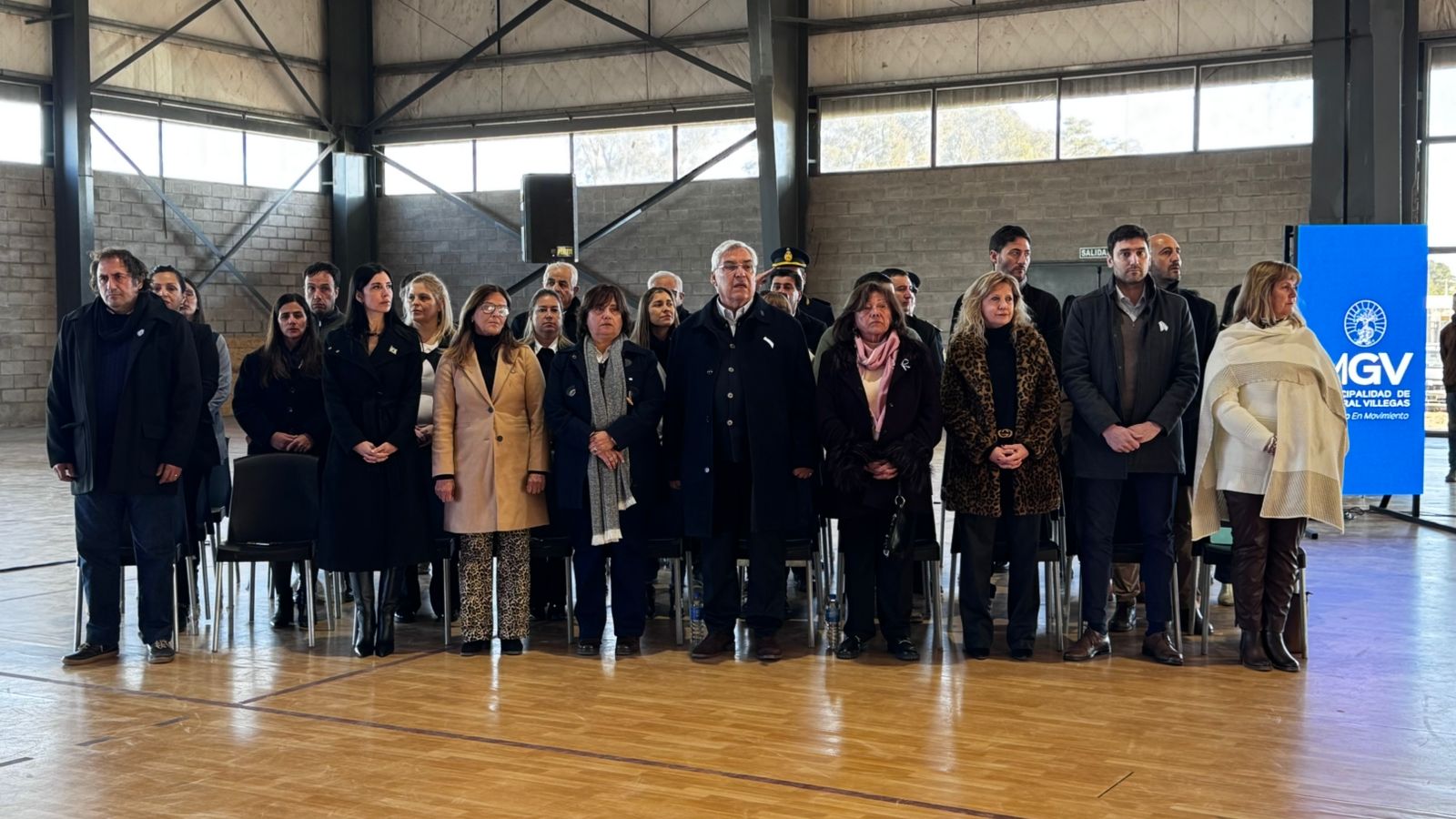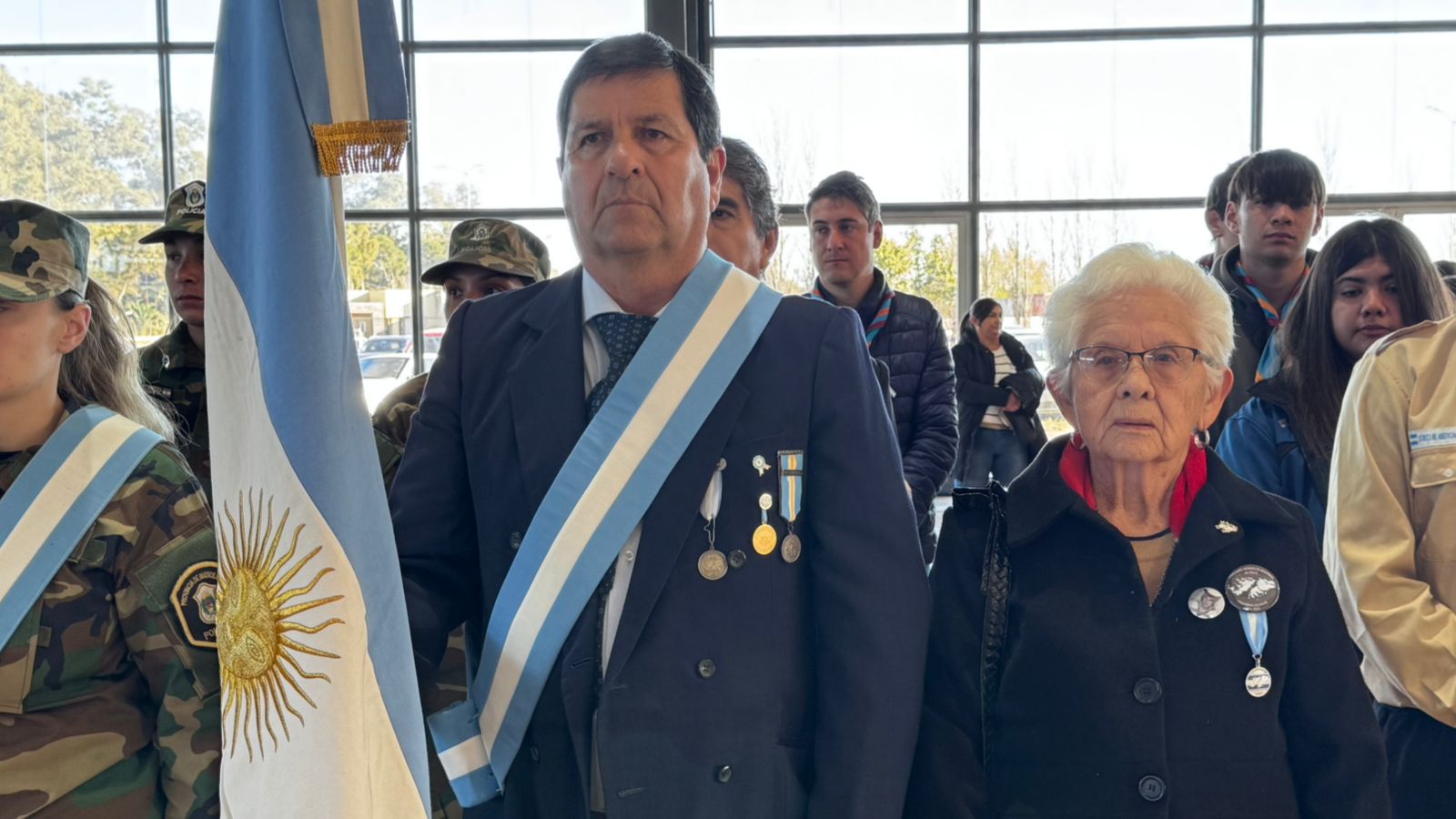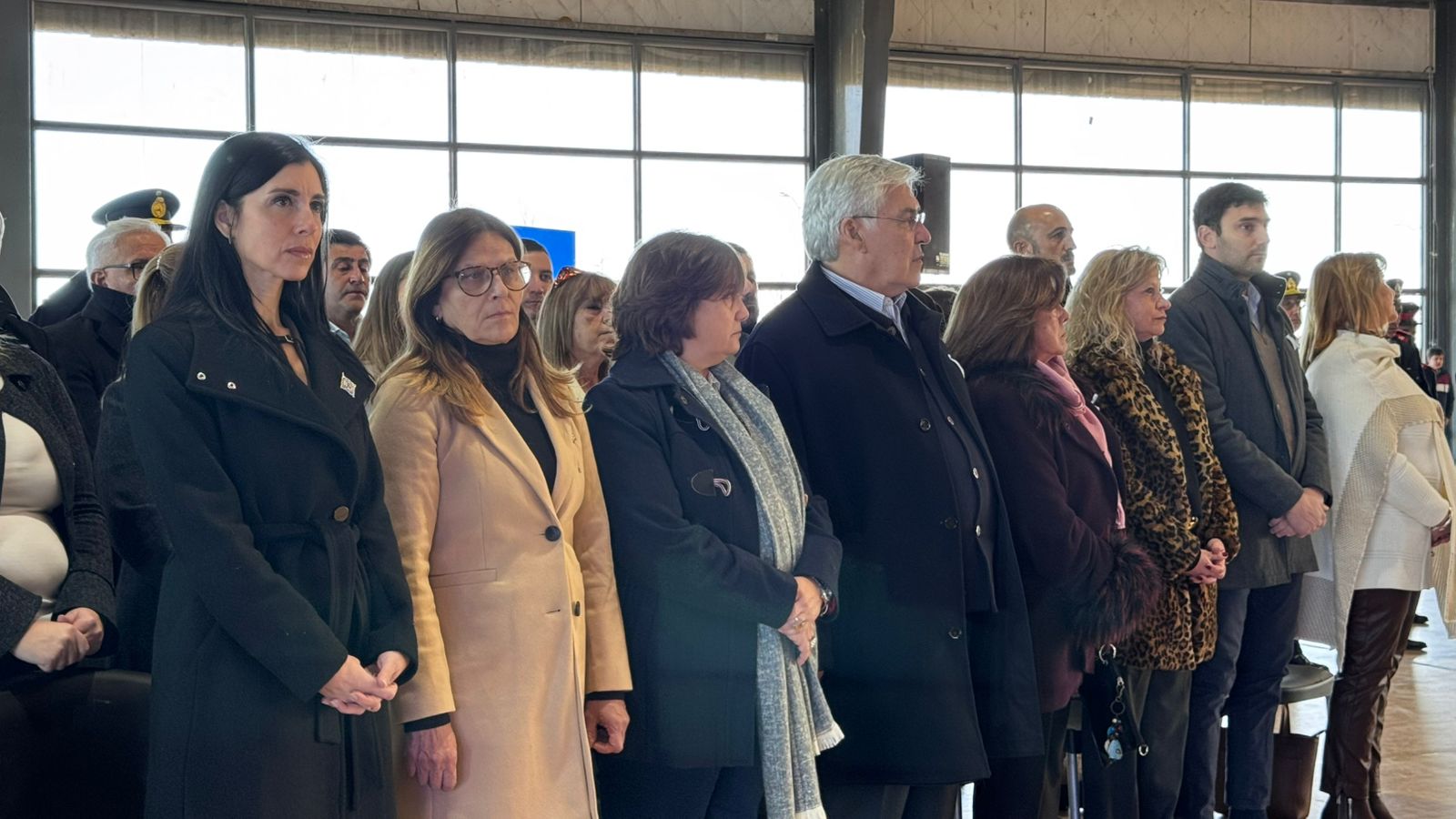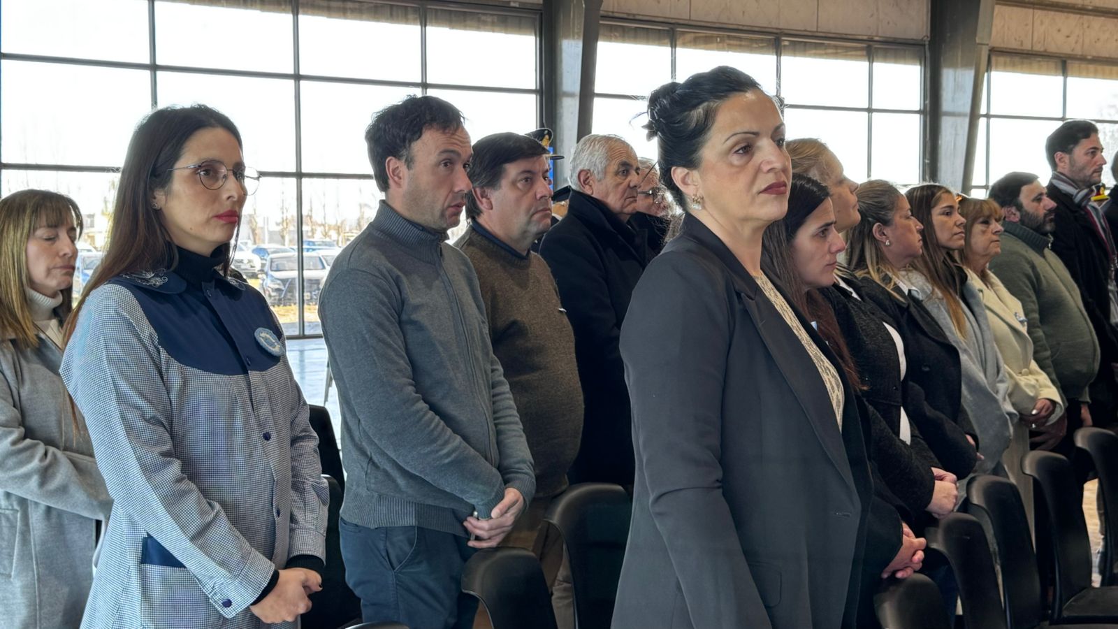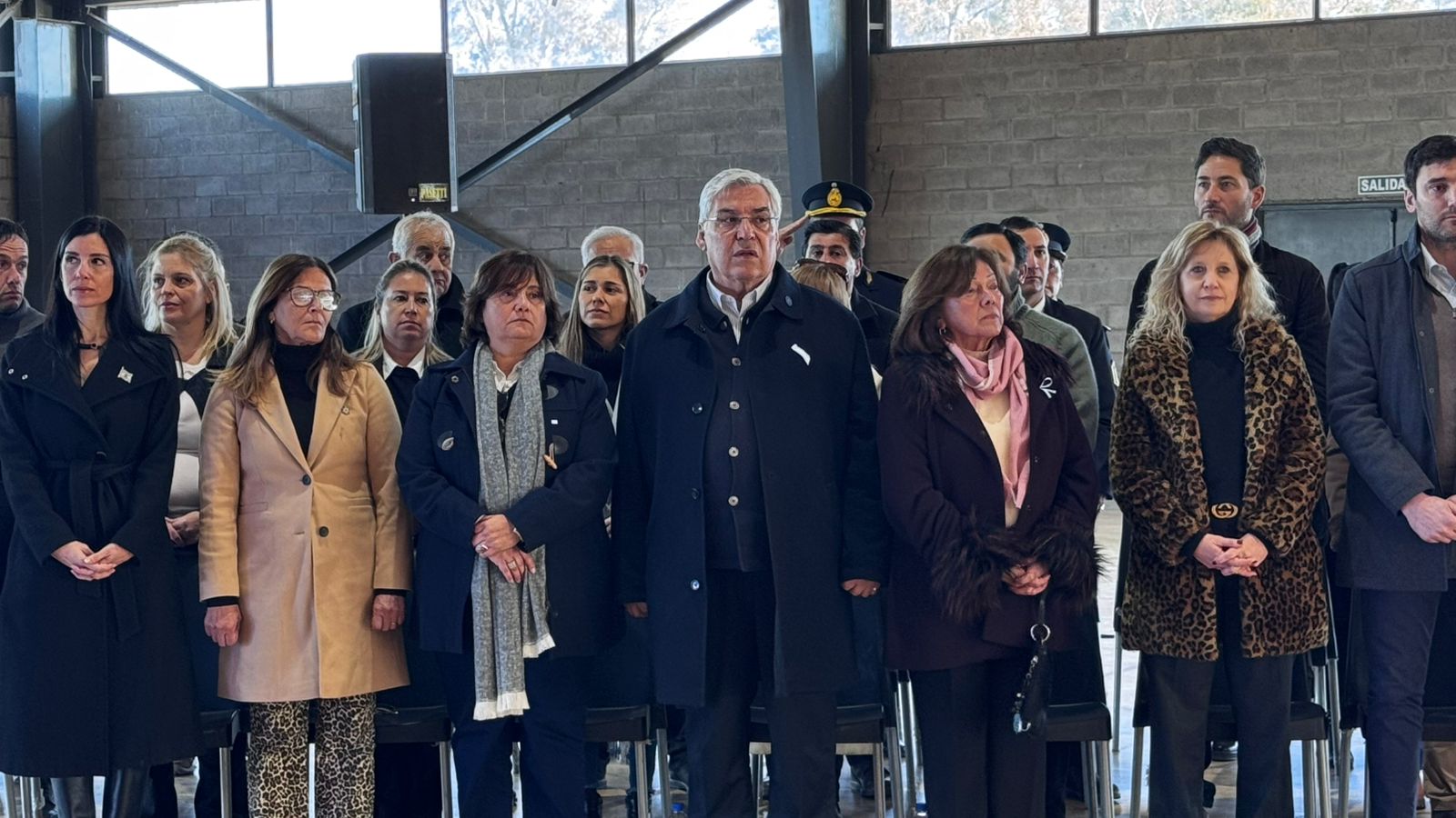 El evento protocolar contó con la presencia de funcionarios del Ejecutivo municipal, la presidente del Concejo Deliberante, concejales, consejeros escolares y autoridades del ámbito de la educación, así como abanderados y escoltas de instituciones educativas e instituciones intermedias, además de vecinos de la comunidad.