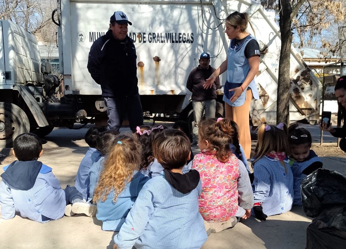 Los alumnos de la sala verde del turno tarde del Jardín de Infantes Nº 913 “Susana Canibano”, de General Villegas, desarrollaron el proyecto “El corralón municipal de la ciudad de General Villegas: los recolectores de basura”, con el objetivo de conocer su funcionamiento, promover el cuidado del medio ambiente y valorar el trabajo de quienes se ocupan de la limpieza urbana.