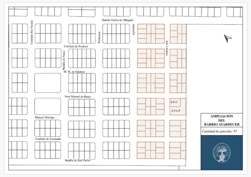 Mediante Decreto del Departamento Ejecutivo, se aprobó el Pliego de Bases y Condiciones para la adjudicación de terrenos municipales, ampliación del Barrio Atardecer, ubicados en la conocida Quinta de Handorf, un predio de 5 hectáreas delimitado por las calles Ayacucho, Vuelta de Obligado y Batalla San Carlos.