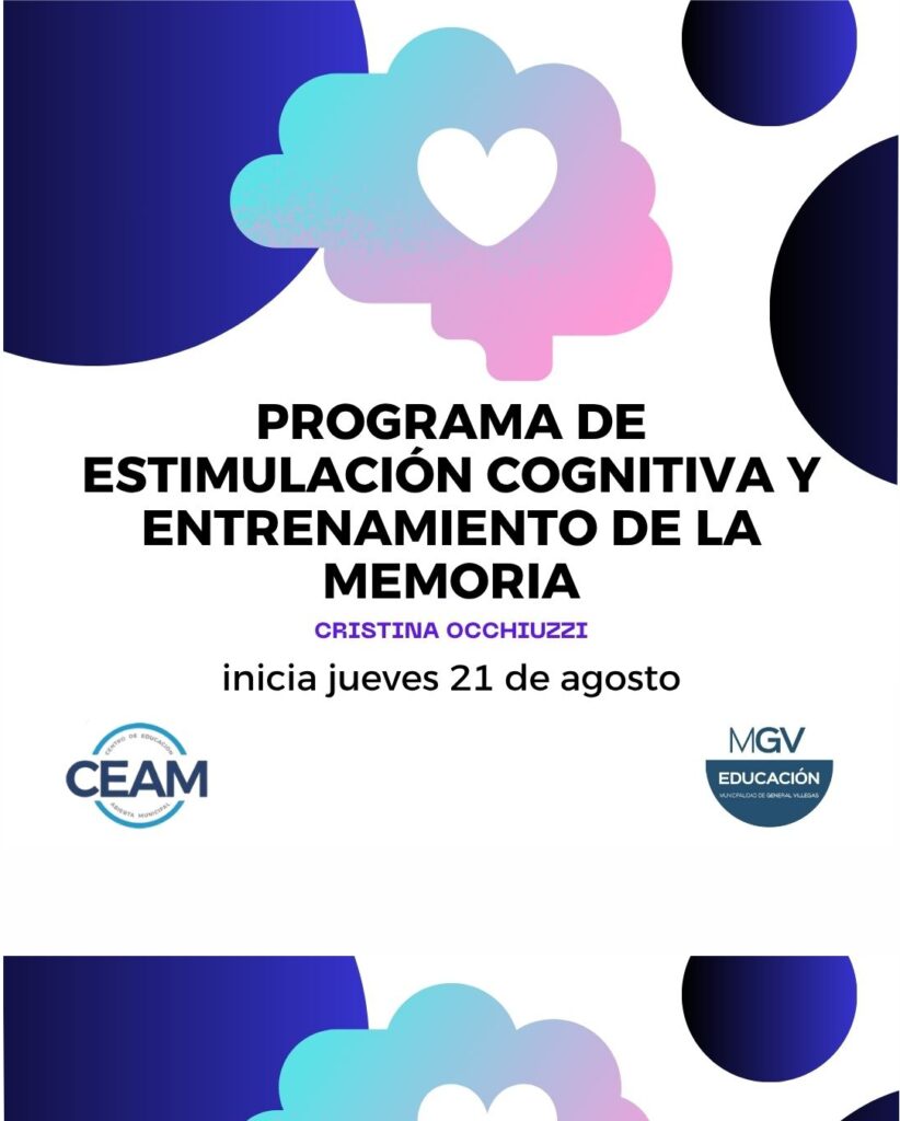 La Secretaría de Educación de la Municipalidad de General Villegas, a través del Centro de Educación Abierta Municipal (CEAM), invita a la comunidad a participar de un taller especial sobre Estimulación Cognitiva y Entrenamiento de la Memoria, a cargo de Cristina Occhiuzzi.