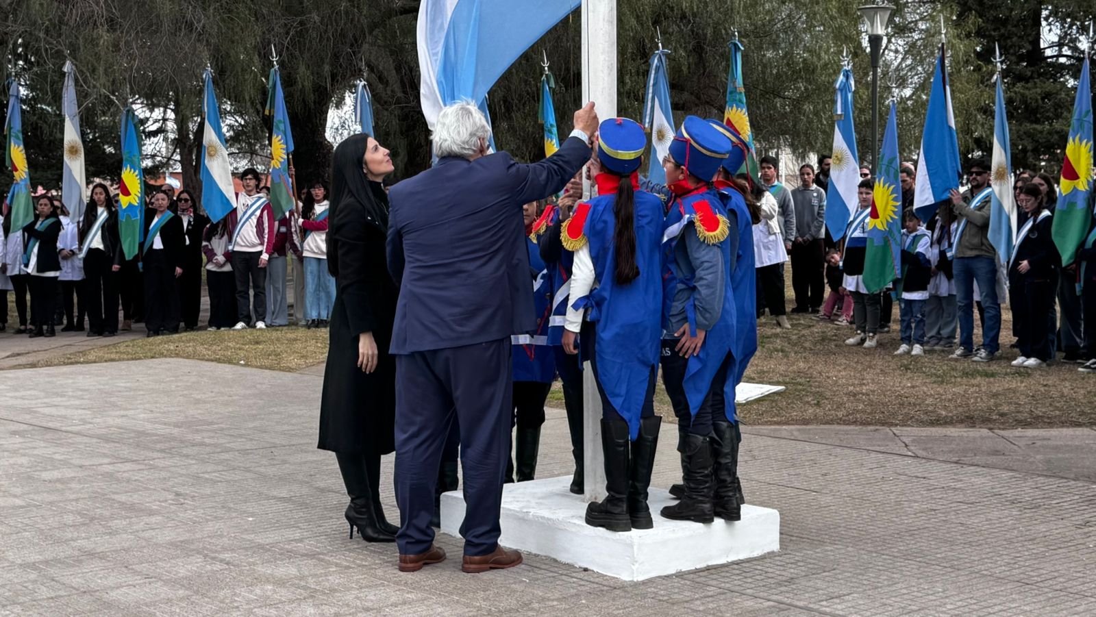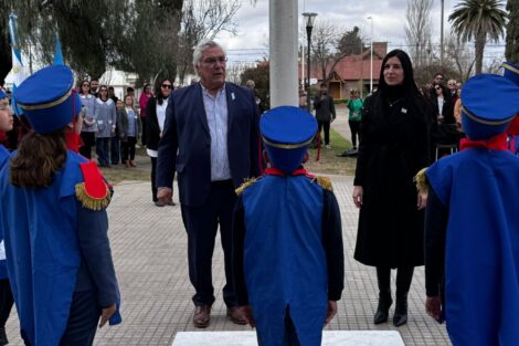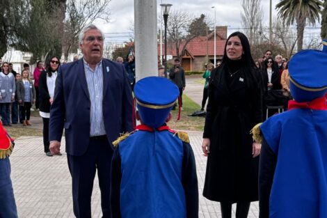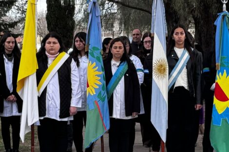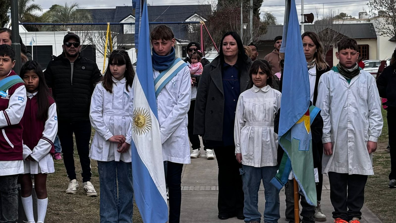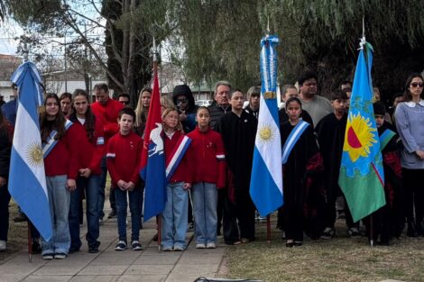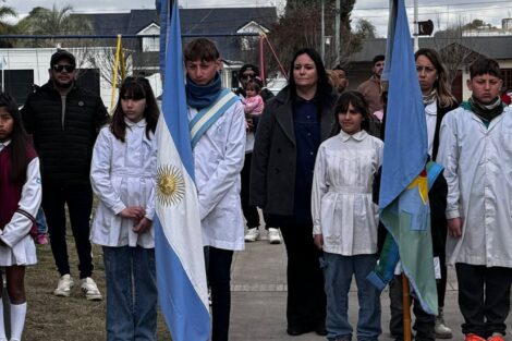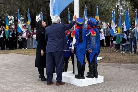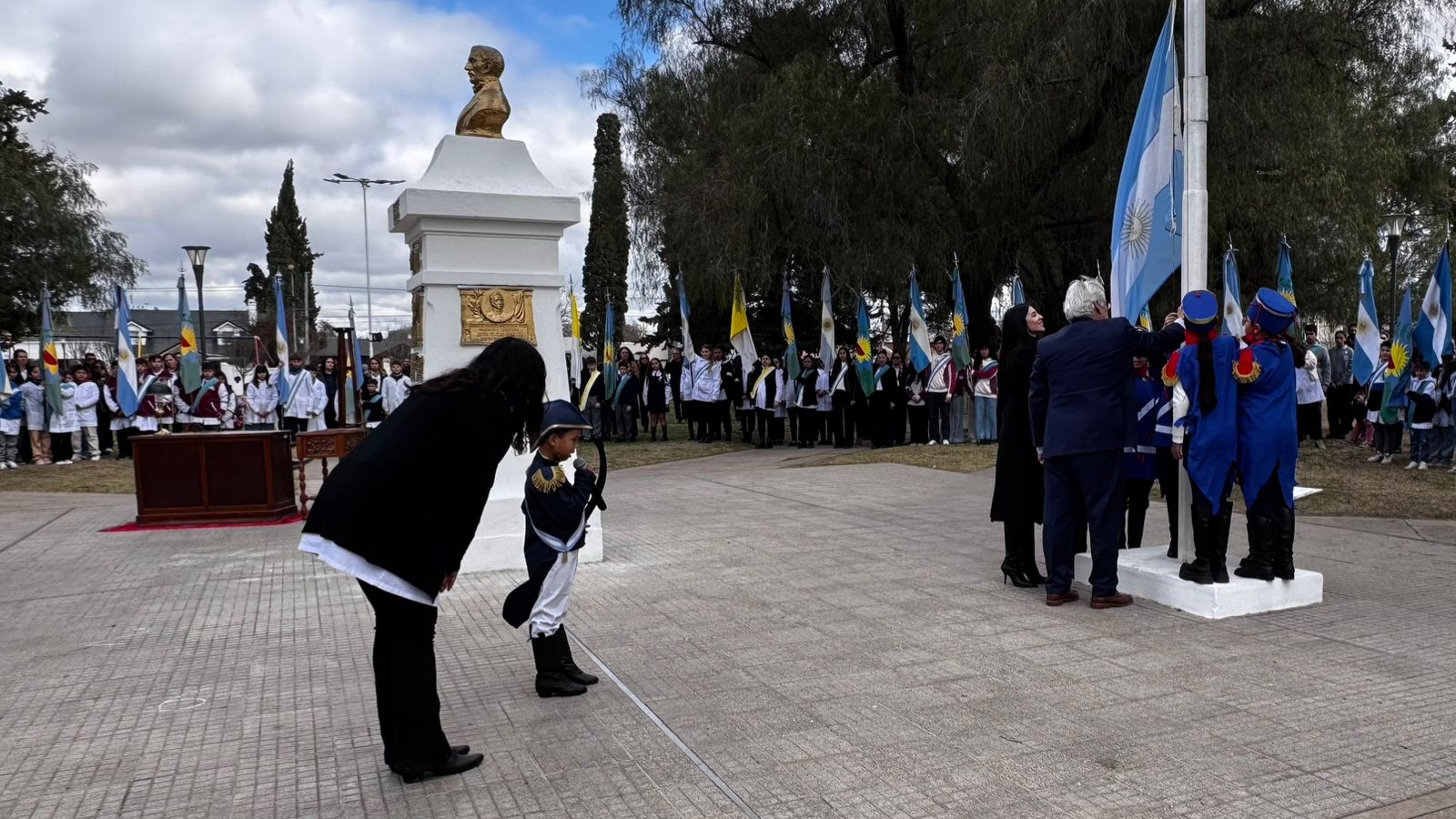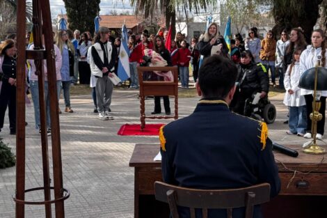 Seguidamente, el Intendente Municipal y la secretaria de Educación y Cultura, Valeria Iglesias, junto a los granaderos alumnos de la Escuela Primaria N°17, izaron el pabellón nacional con toque a silencio y se entonaron las estrofas del Himno Nacional Argentino.