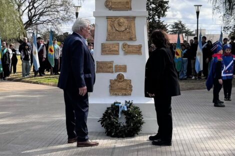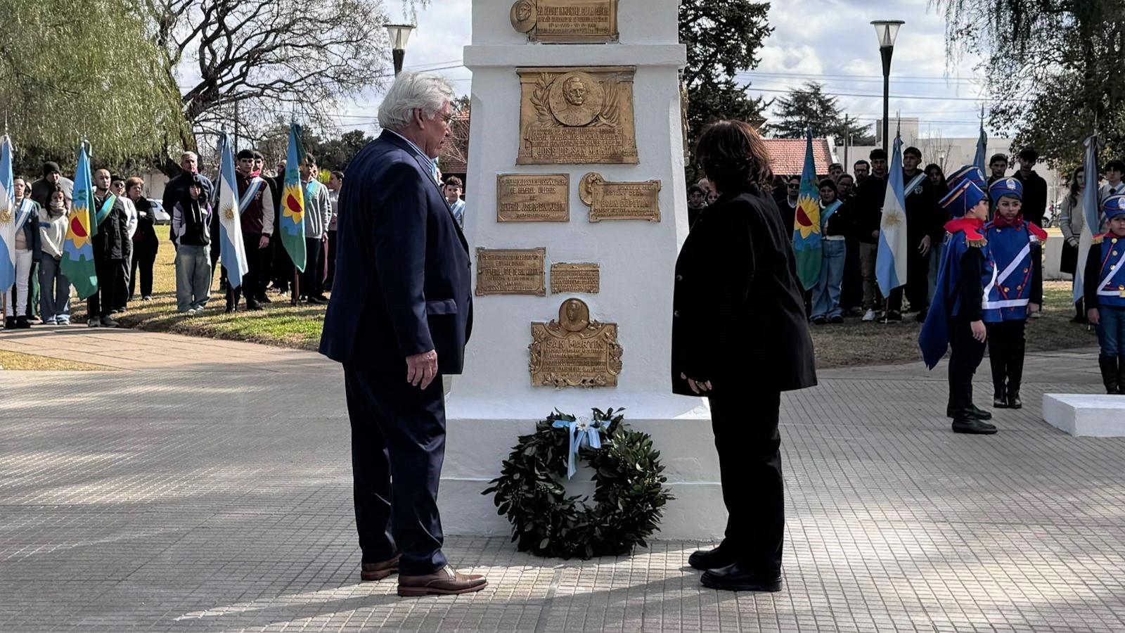 El intendente Alegre y la presidente del Concejo Deliberante, Claudia Esain colocaron la corona de laureles en el busto del General San Martín, ubicado en el centro de la plaza, tras lo cual el Pbro. Tomasz Wargocki ofreció una oración a la Patria.
