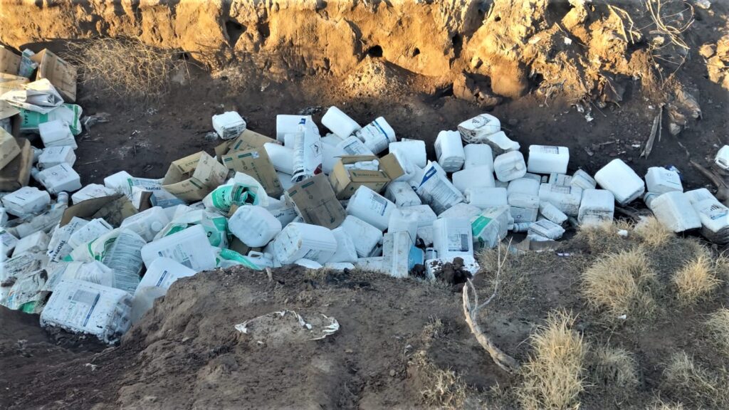 Durante el procedimiento se constató la presencia de 246 envases de fitosanitarios (bidones de 20, 10 y 5 litros, botellones plásticos y cajas de cartón) que habían sido depositados de manera intencional en una cava, en infracción a la normativa nacional y municipal vigente. Hasta el momento se desconoce la identidad del responsable de este hecho.