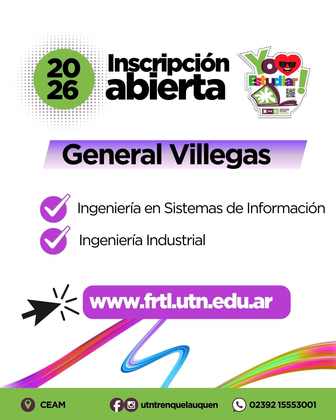La Secretaría de Educación de la Municipalidad de General Villegas a través de la Facultad Regional Trenque Lauquen de la UTN informa que ya está habilitada la inscripción online para sus carreras de grado en General Villegas y Trenque Lauquen.