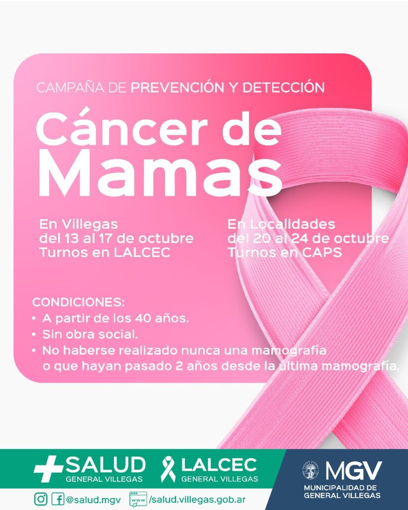 Del 13 al 17 de octubre en General Villegas y del 20 al 24 de octubre en las localidades del partido, se desarrollará una nueva edición de la Campaña de Prevención y Detección del Cáncer de Mama, organizada por LALCEC Filial General Villegas junto a la Municipalidad de General Villegas, a través del área de Salud.