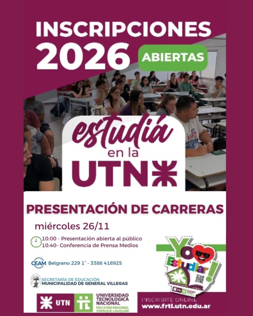 La Secretaría de Educación de la Municipalidad de General Villegas, a través del Centro de Educación Abierta Municipal (CEAM), invita a la comunidad y a los medios de comunicación a participar de la presentación de las nuevas carreras que la Universidad Tecnológica Nacional – Facultad Regional Trenque Lauquen (UTN FRTL) proyecta para el ciclo 2026.