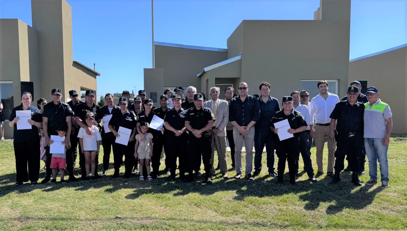 El jueves 18 de diciembre a las 16 horas se realizó el acto de entrega de 12 viviendas destinadas al personal policial, construidas a través de la Caja de Retiros, Jubilaciones y Pensiones de la Policía de la Provincia de Buenos Aires. La actividad fue presidida por el intendente municipal, Gilberto Alegre, y el presidente de la Caja, Comisario Retirado Carlos Langone.