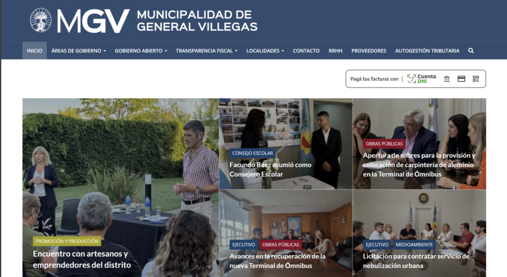 PASO 1: Ingresa a www.villegas.gob.ar y localizá en la sección superior de la web el botón de pago “Pagá tus facturas con…” se encuentra debajo del menú principal a la derecha. Hace click en el botón.