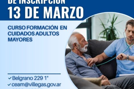 La Secretaría de Educación de la Municipalidad de General Villegas, en conjunto con el Hospital Municipal, informa que se prorrogó hasta el jueves 13 de marzo la inscripción y la entrega de documentación para el Curso de Operador de Cuidados de Adultos Mayores.