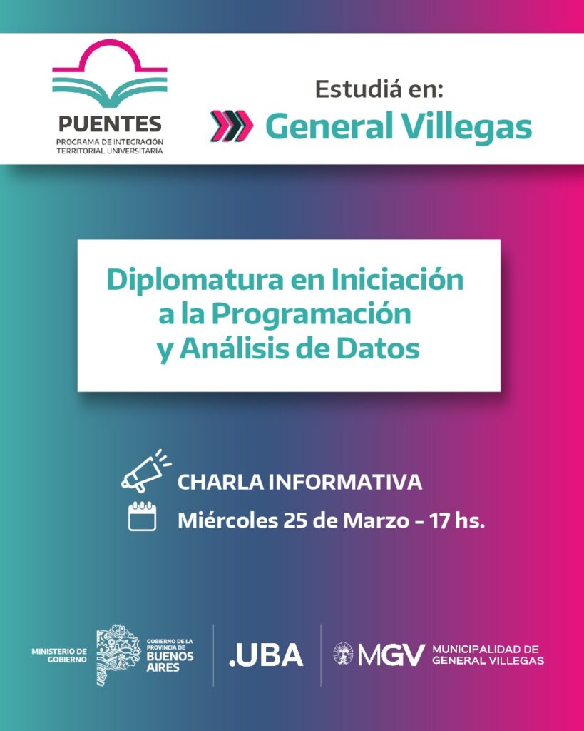 El Centro de Educación Abierta Municipal (CEAM), dependiente de la Secretaría de Educación de la Municipalidad de General Villegas, junto al Programa Puentes, invita a la comunidad a participar de una charla informativa sobre la Diplomatura en Iniciación a la Programación y Análisis de Datos.